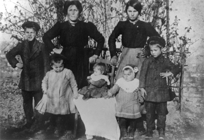 Nel 1917 Luigia Fabruzzo chiama il fotografo per avere una foto da mandare al marito Antonio in guerra. Eccola. Da sinistra vediamo Odoardo che abiterà in seguito sempre accanto al duomo di Concordia, Antonio, Candida seduta sulla sedia, Bruno e Giovanni che nella foto ha 8 anni. Dietro c'è la sorella più vecchia che si chiama Unica. È nata nel 1902 ed è morta nel 1932 per complicanze del quarto parto. L'ultimo figlio aveva una settimana di vita.